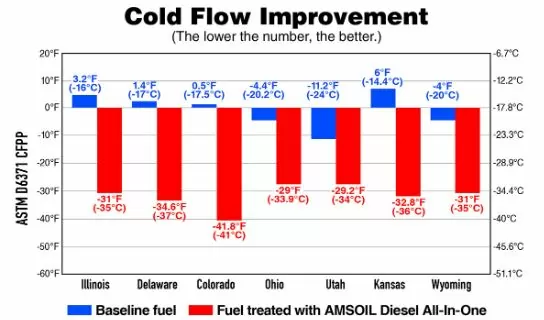 AMSOIL Diesel Cold Flow lowers the CFPP by up to 15ºC in ultra-low-sulfur diesel fuel (ULSD). It uses a jet-fuel-type deicer that disperses water to control ice formation throughout the fuel system. AMSOIL Diesel Cold Flow also inhibits wax crystal formation, allowing fuel to flow to the engine more easily and improving diesel engine reliability in cold temperatures.